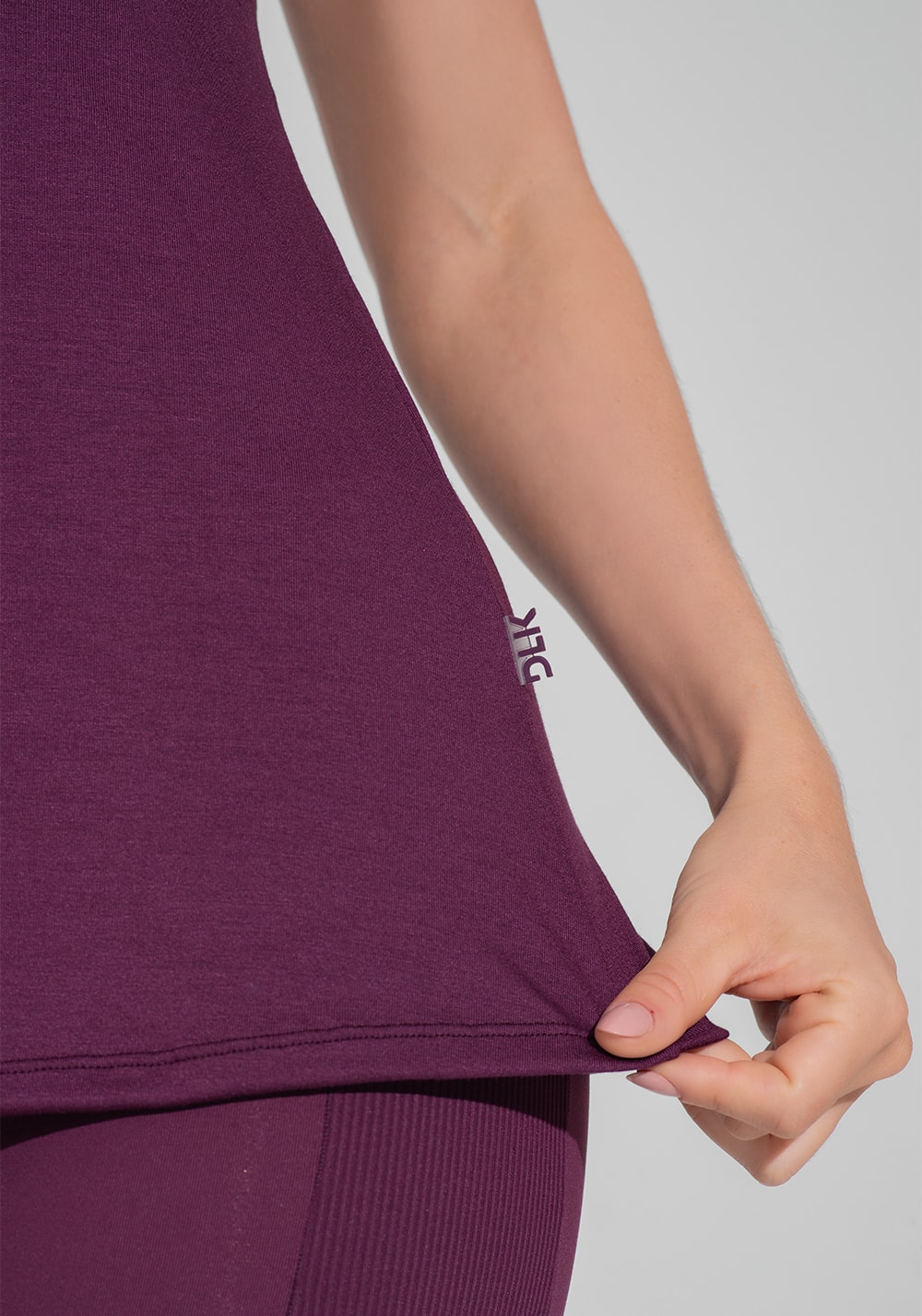 A blusa fitness alongada é confeccionada em modal, uma fibra biodegradável de toque macio com alta capacidade de absorção de umidade e respirabilidade, auxiliando no controle do suor e mantendo o conforto durante o uso.