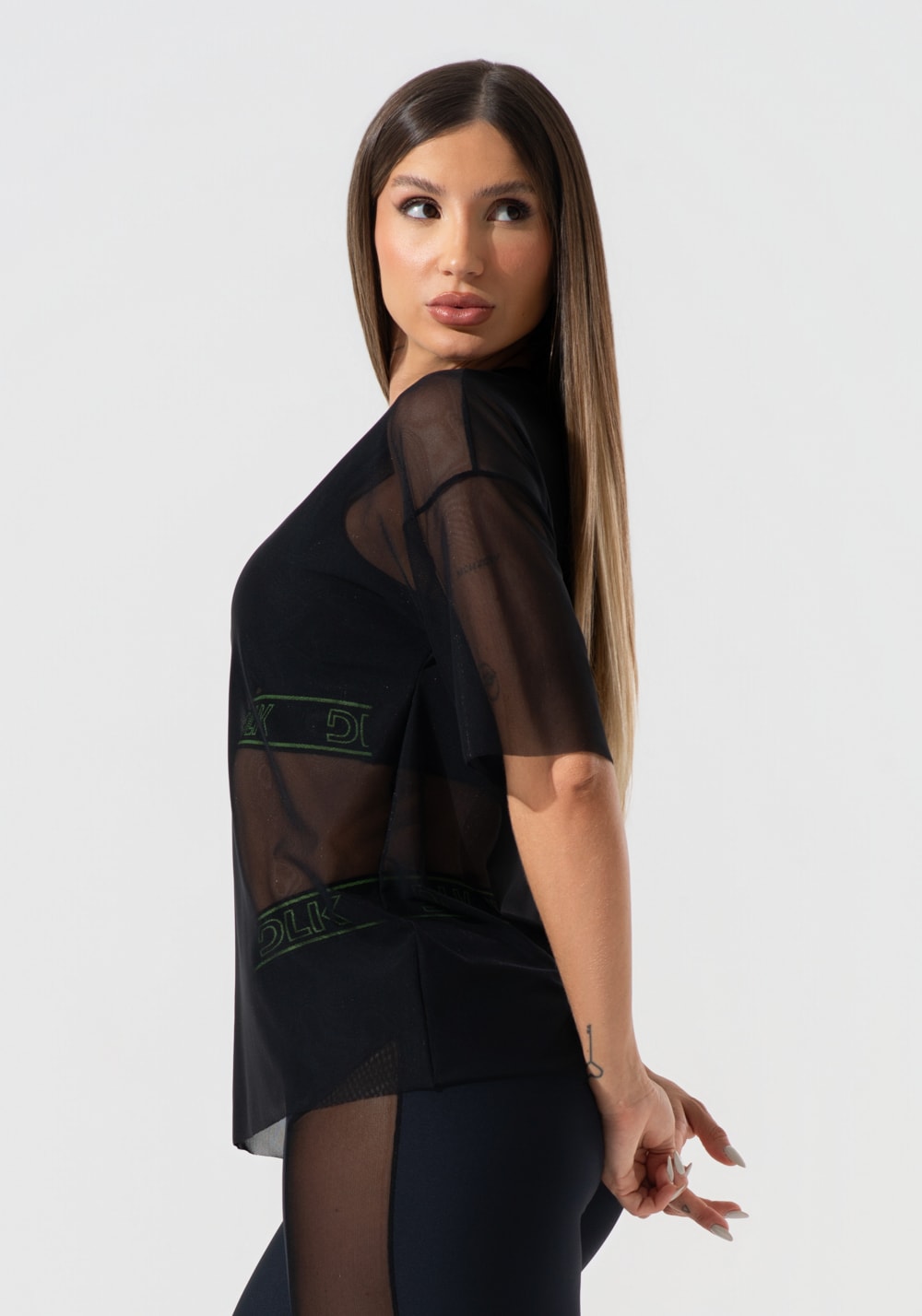 Com modelagem tipo t-shirt, essa blusa de tule preta alia a estética esportiva ao conforto de um caimento mais soltinho. O tecido leve garante frescor, enquanto o visual moderno se encaixa tanto no treino quanto no dia a dia.