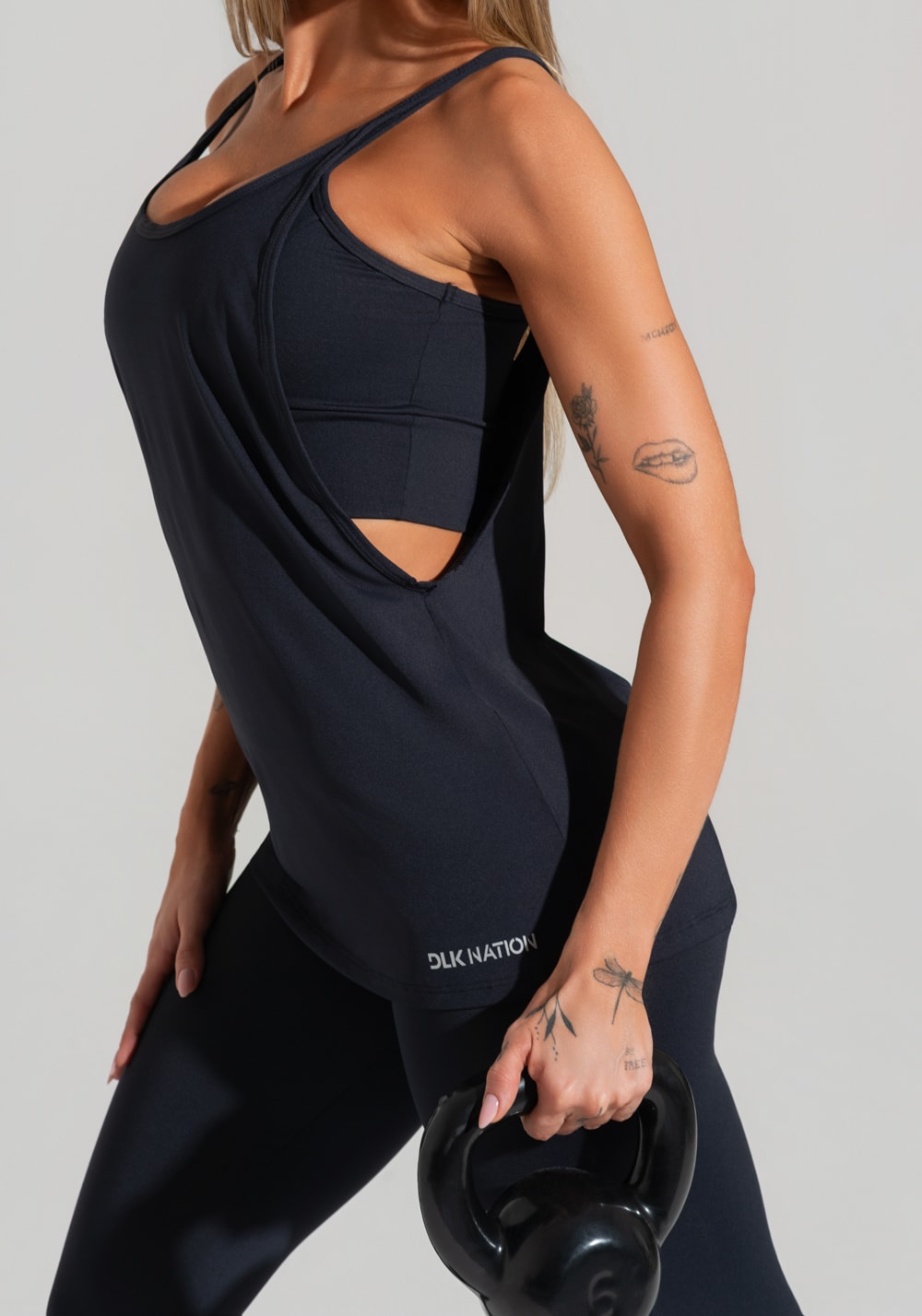 A camiseta preta com alça fina e maxi cava é perfeita para quem busca leveza e estilo nos treinos. O tecido em poliamida proporciona toque suave e secagem rápida, enquanto o caimento solto e o design cavado valorizam sobreposições com tops de impacto.