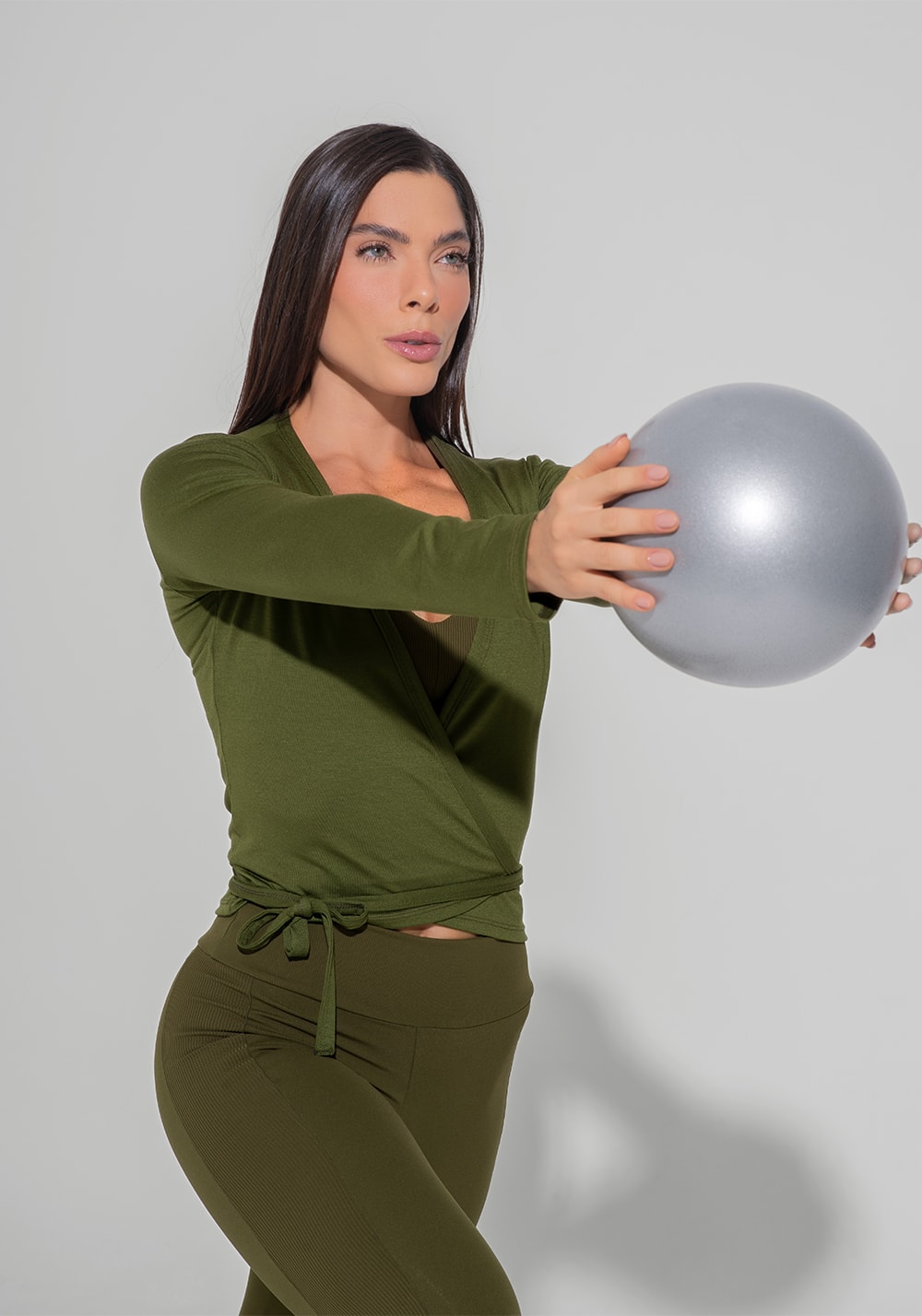 A modelagem com mangas longas amplia a cobertura, sendo ideal para o uso antes, durante ou após atividades leves como alongamento, yoga e pilates.