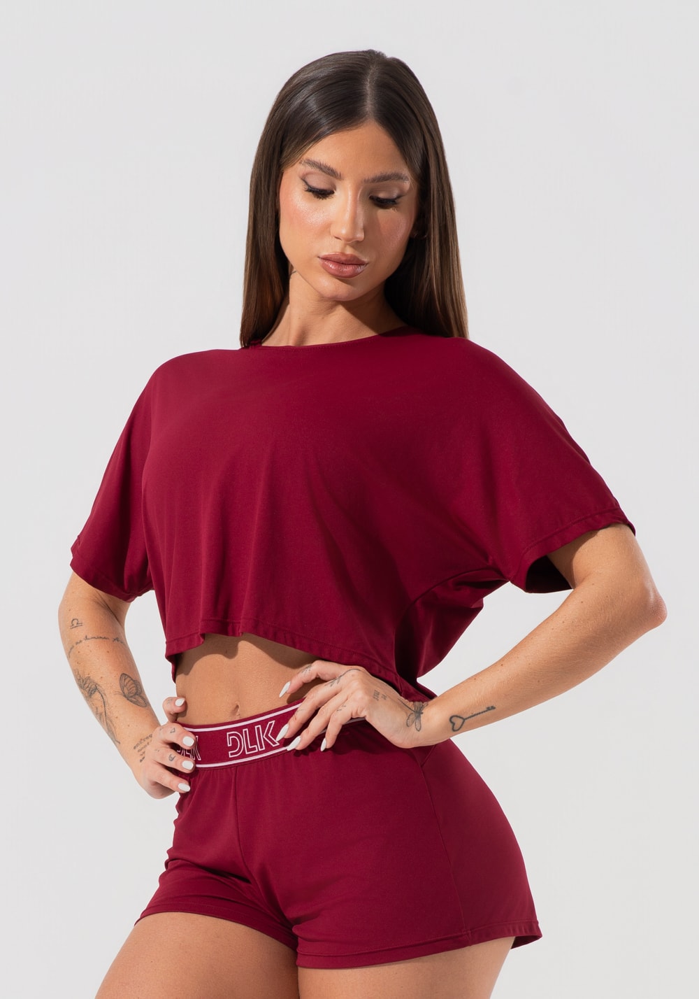 Feito em poliamida, esse cropped vinho possui modelagem soltinha e leve. O elástico vinho com rosa nas costas proporciona um visual moderno e estiloso.