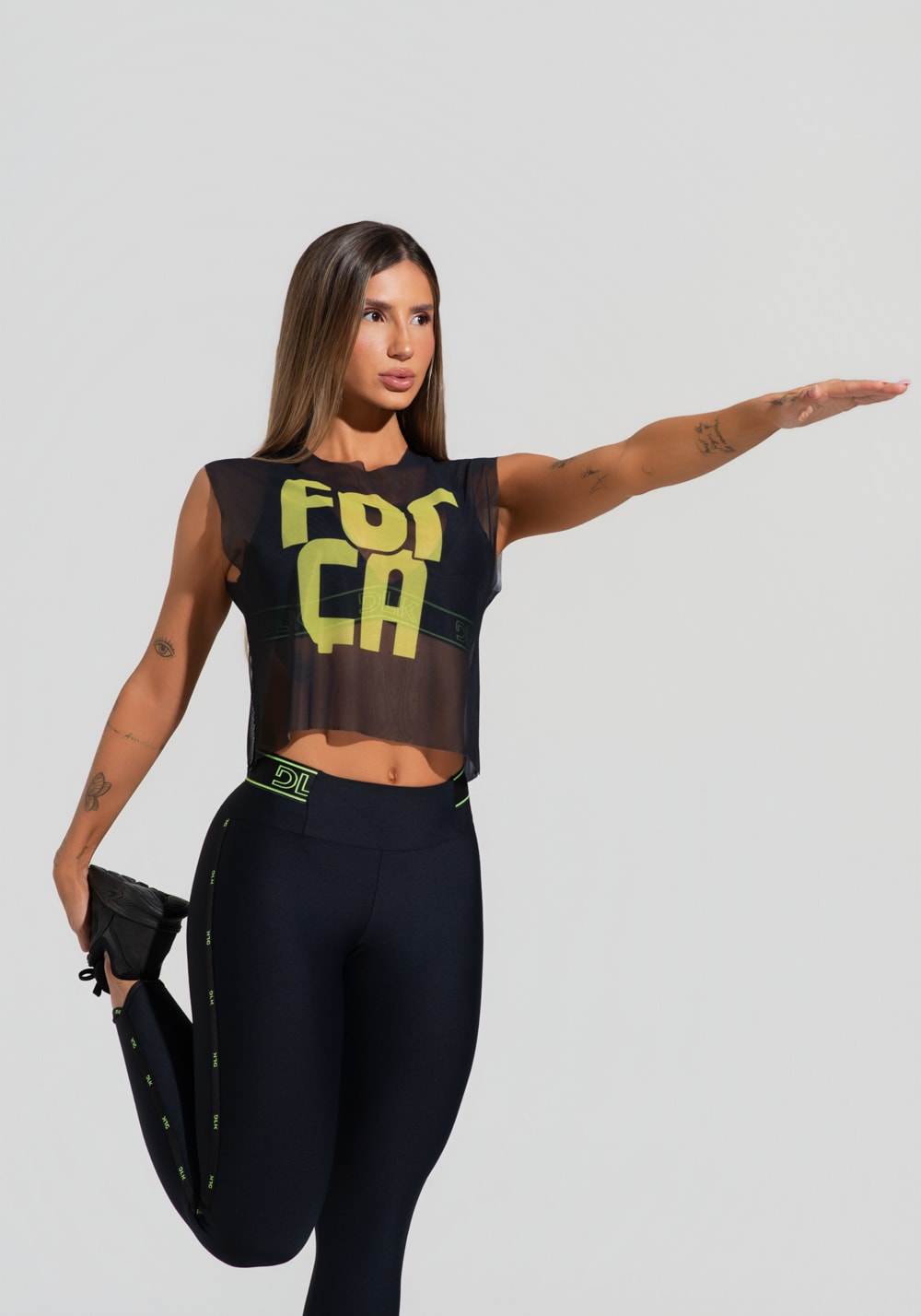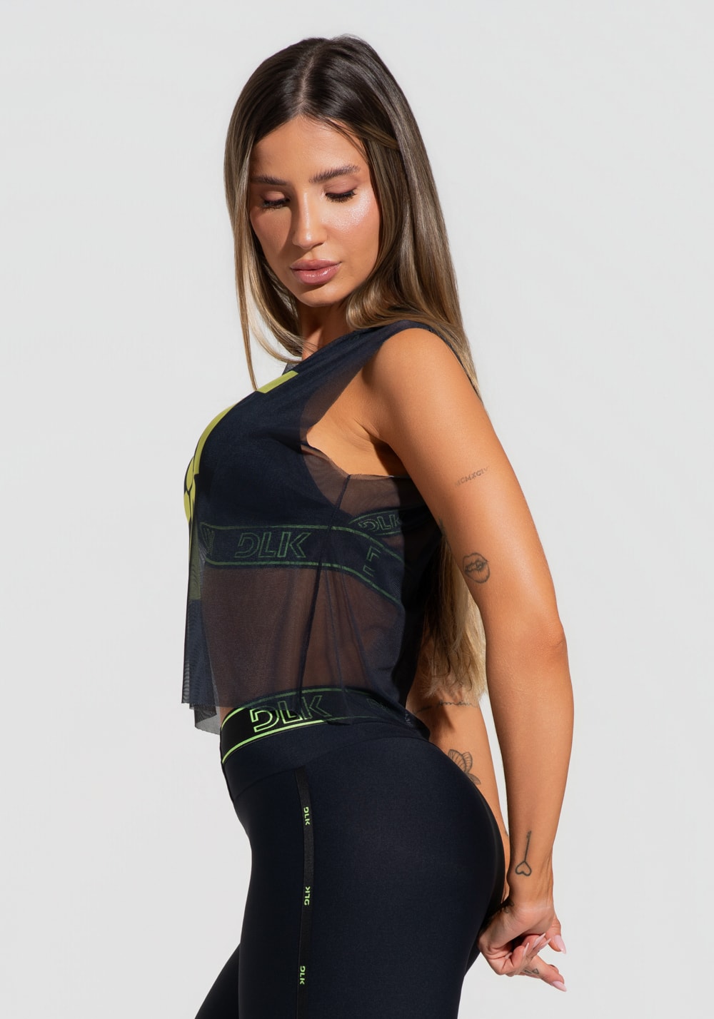 Cropped feminino de tule preto estampado força activity dlk