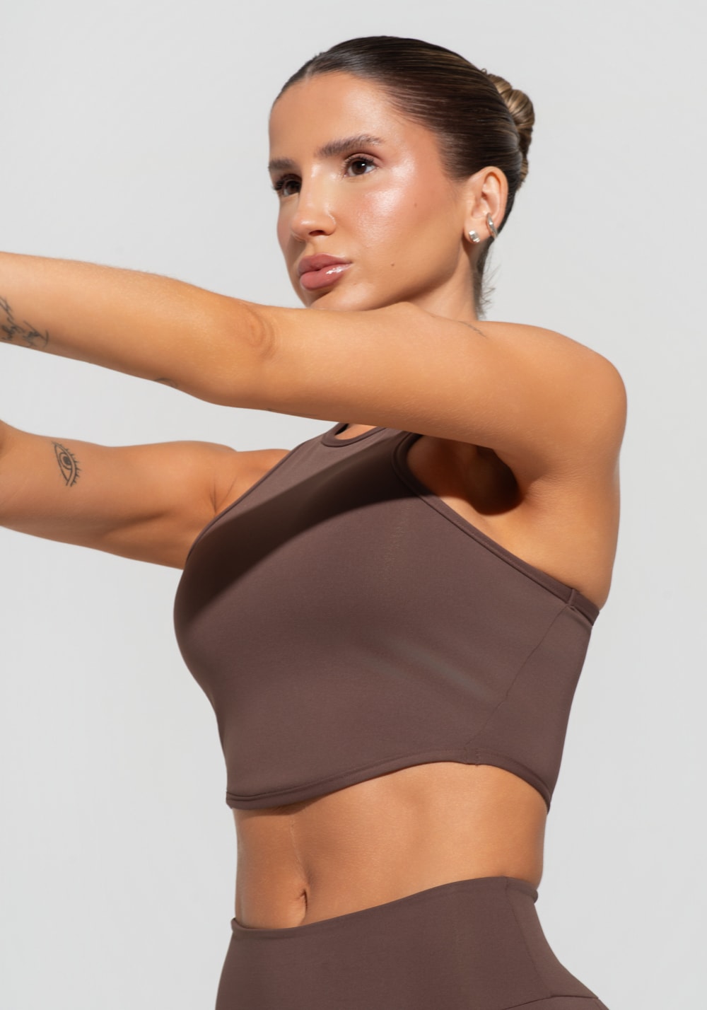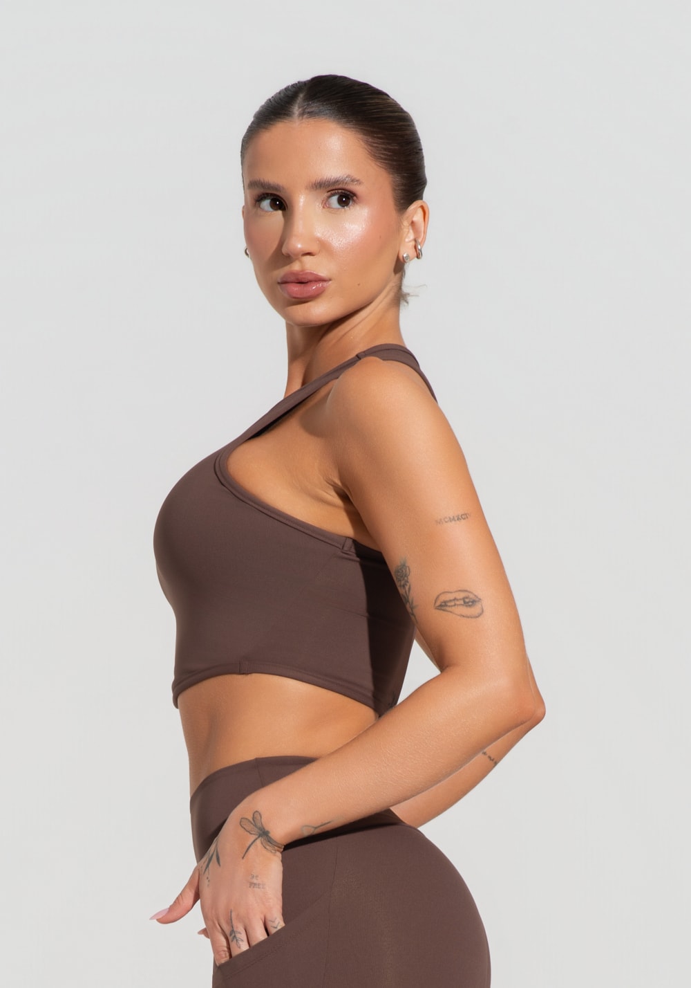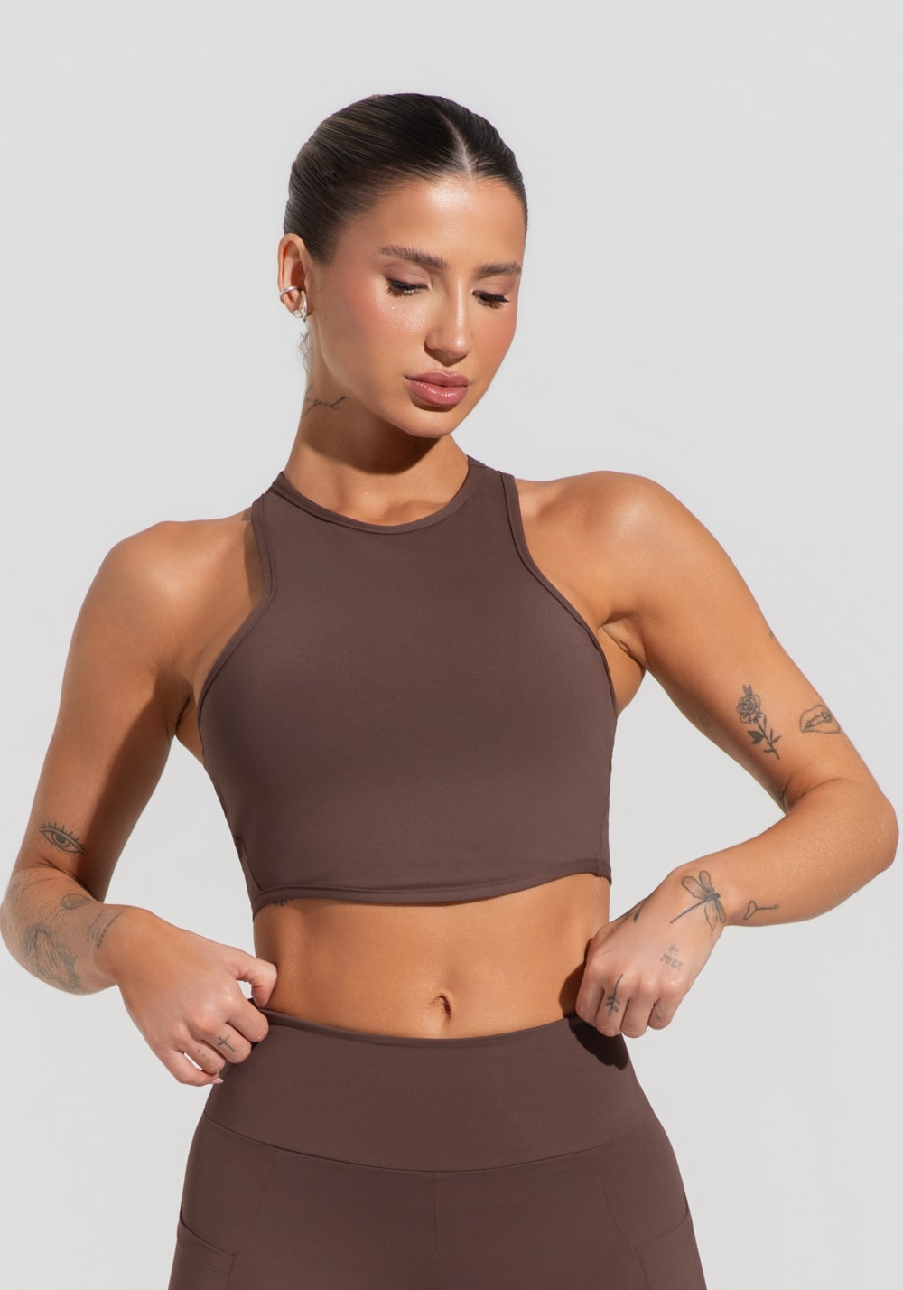 Com visual marcante e modelagem ajustada, o cropped valoriza os ombros com equilíbrio entre design esportivo e delicado. A cava americana garante charme e deixa as escápulas livres para se mover com fluidez. Uma peça feita para treinar com estilo e conforto.