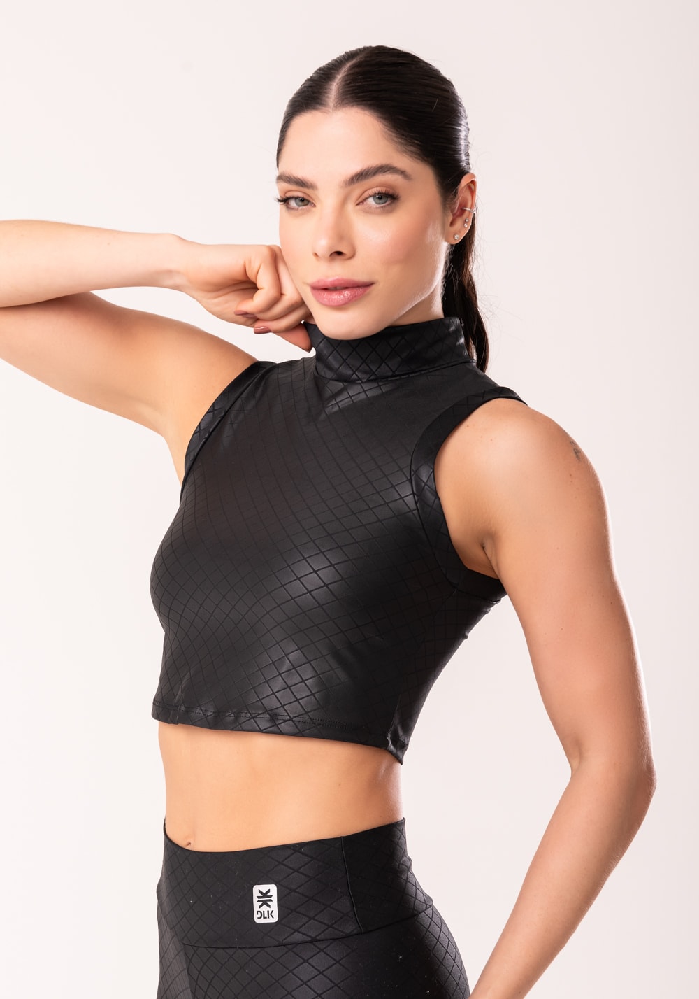 Esse cropped é de malha em suplex de poliéster e elastano, de toque suave levemente brilhante com textura quadriculada. Ele é de gola alta, compressão leve e proteção UV50+, além de tecnologia Dry que permite maior respiração. É de shape mais justinho!