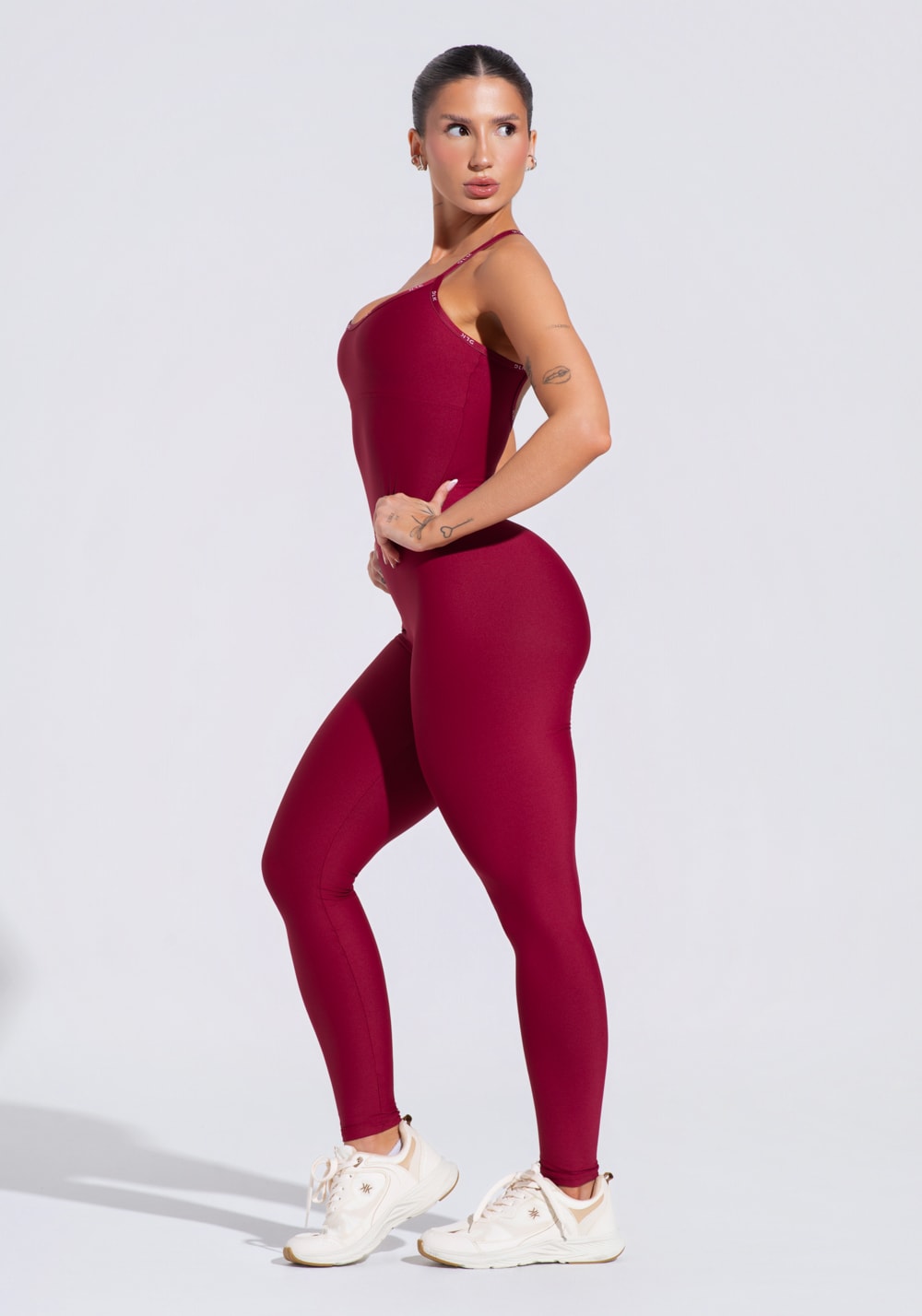 O macacão vinho une performance e estilo em uma única peça. Com design marcante, ele foi pensado para valorizar a silhueta com recortes estratégicos e alças finas cruzadas nas costas, garantindo leveza visual e segurança durante os movimentos.