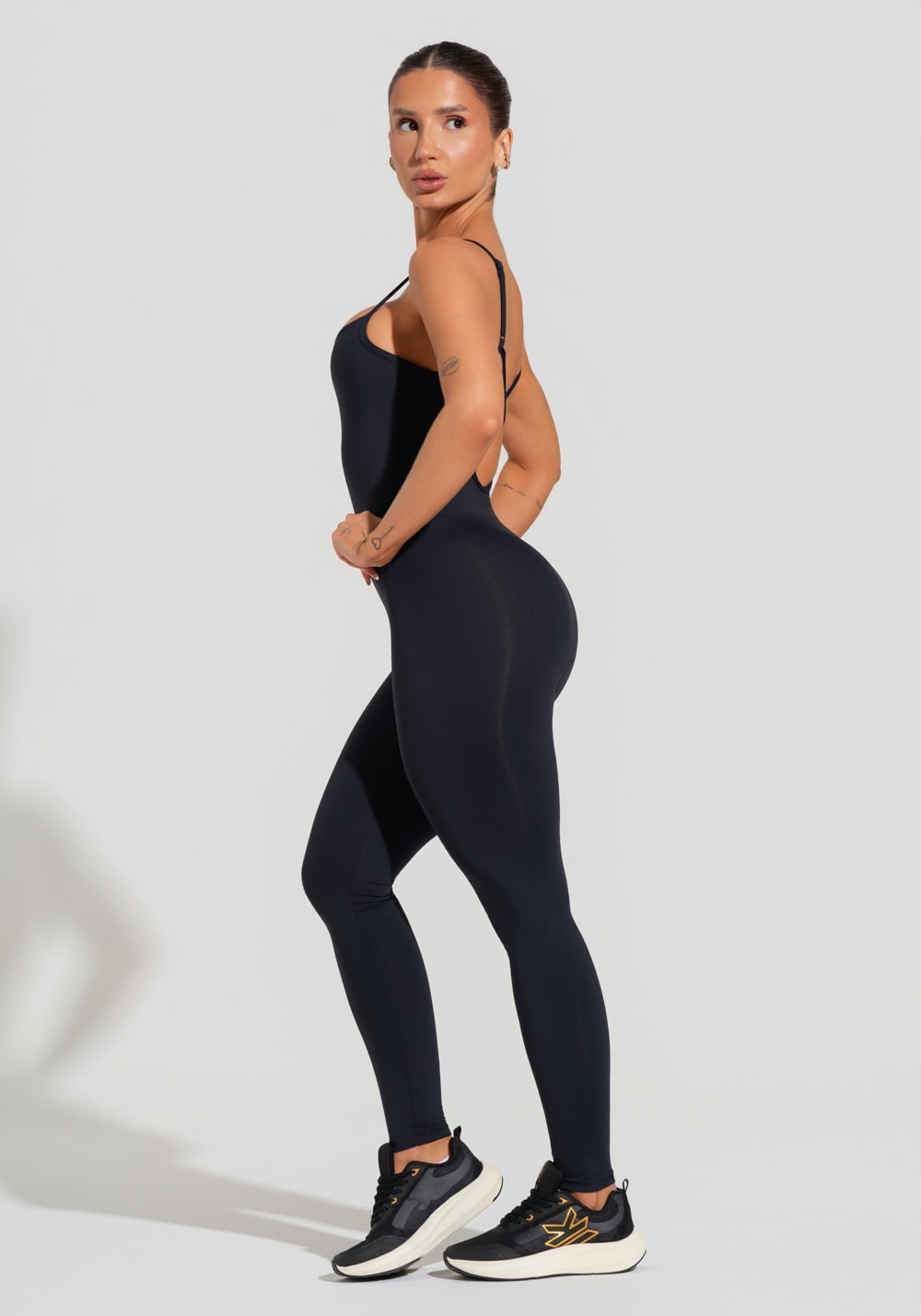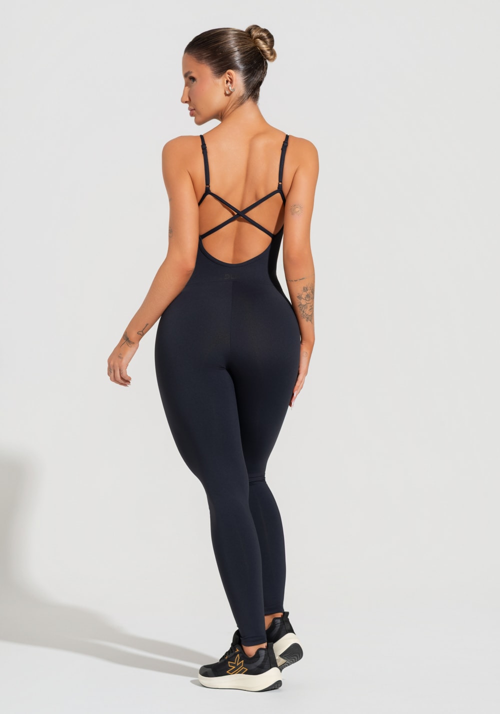 O macacão preto abraça as curvas sem apertar, enquanto as alças finas com regulagem permitem personalizar o encaixe e o conforto nos ombros. Nas costas, o detalhe com tiras cruzadas garante um visual marcante. A peça é produzida em poliamida, que oferece compressão média, toque macio e alta durabilidade.