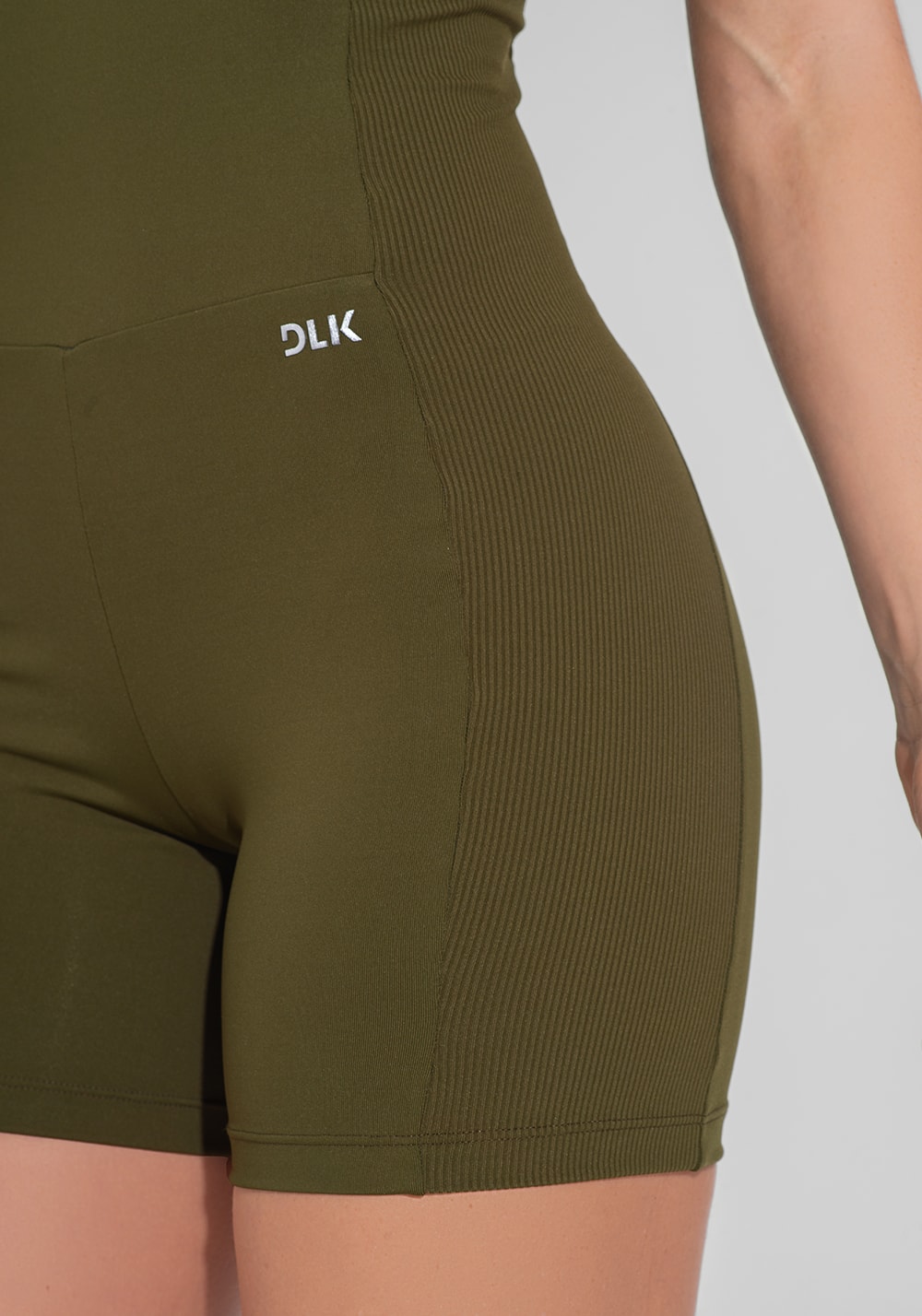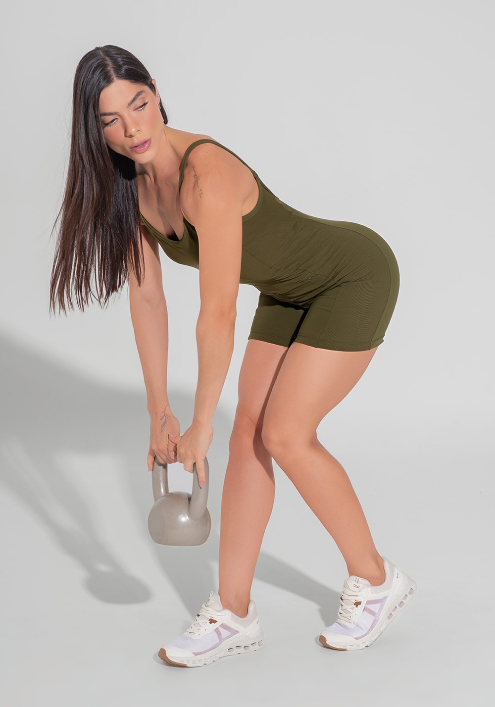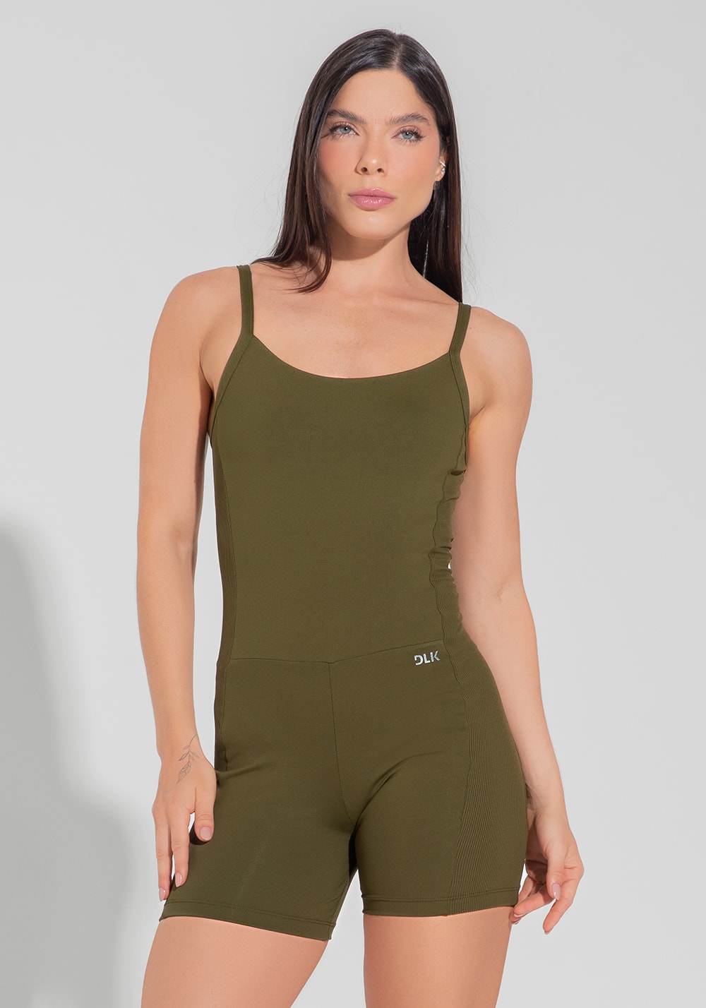 A parte superior desse macaquinho conta com forro interno e elástico embutido no decote, que ajudam a dar sustentação e manter a peça firme no lugar durante as atividades.