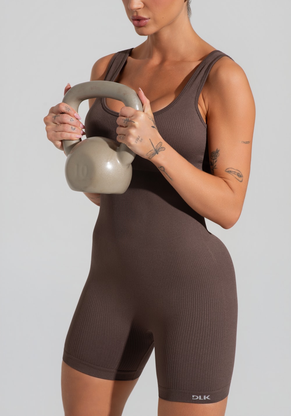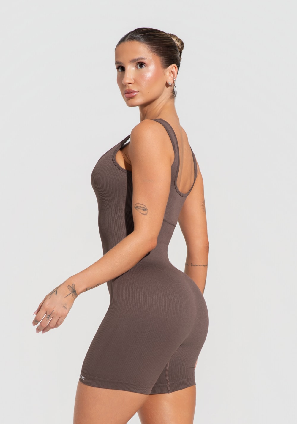 Macaquinho fitness feminino marrom canelado com bojo seamless+ dlk