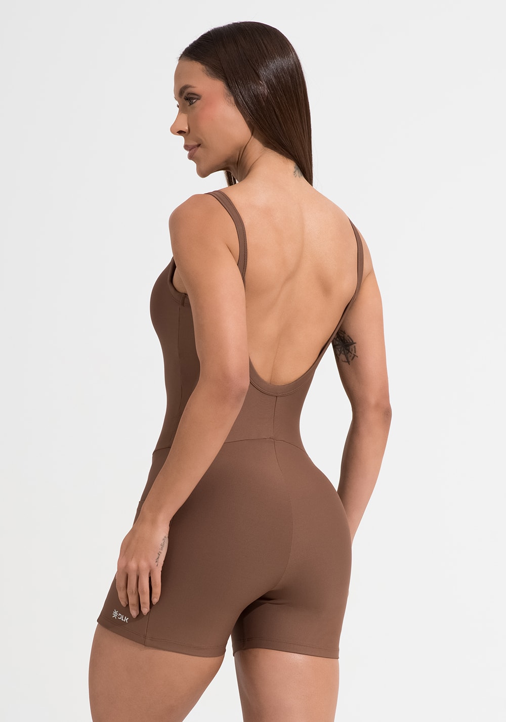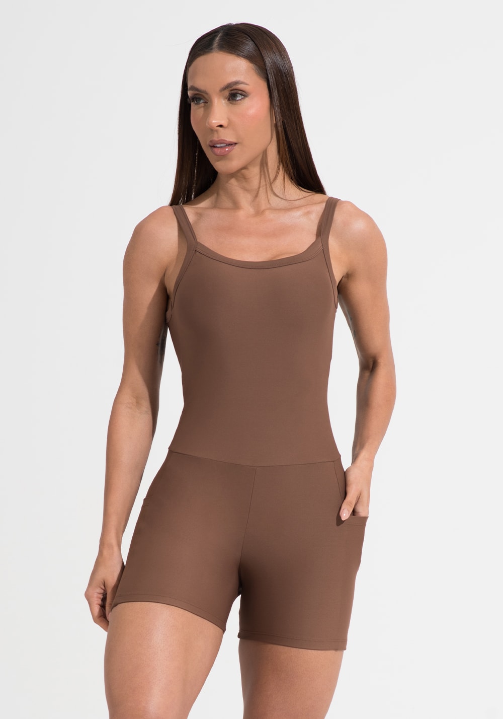O macaquinho marrom com bolsos combina tecnologia e funcionalidade. Sua modelagem ajustada ao corpo e com decote nas costas garante liberdade de movimento, enquanto os bolsos laterais oferecem praticidade para carregar itens essenciais durante os treinos.