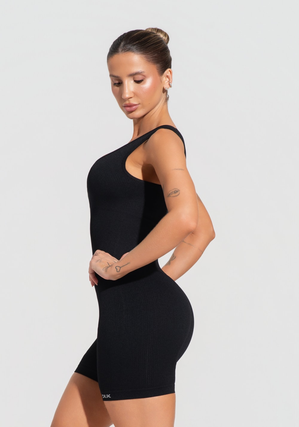 Macaquinho fitness feminino preto canelado com bojo seamless+ dlk