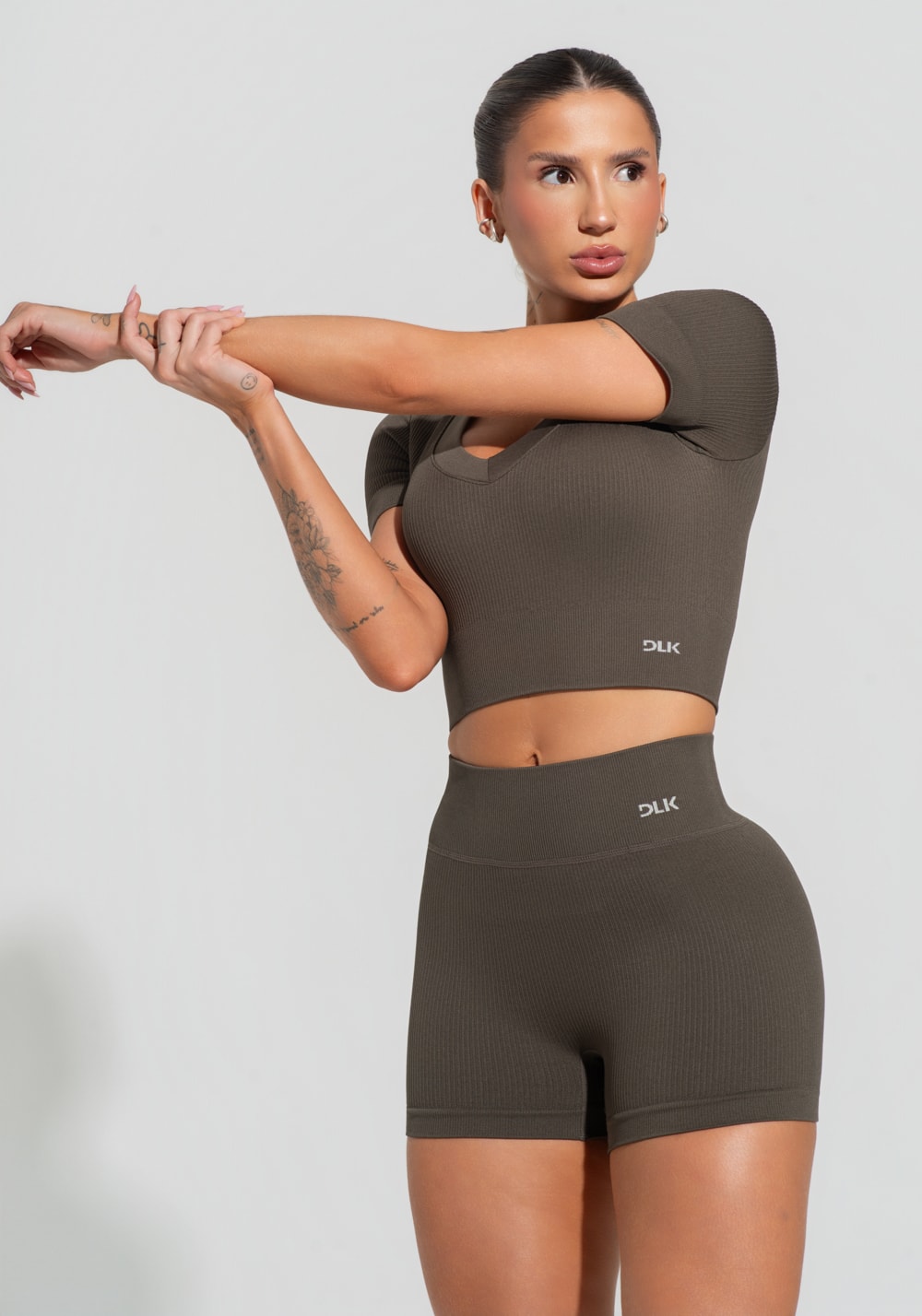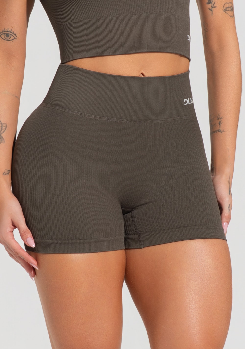 Short fitness feminino verde oliva canelado com cós alto seamless+ dlk