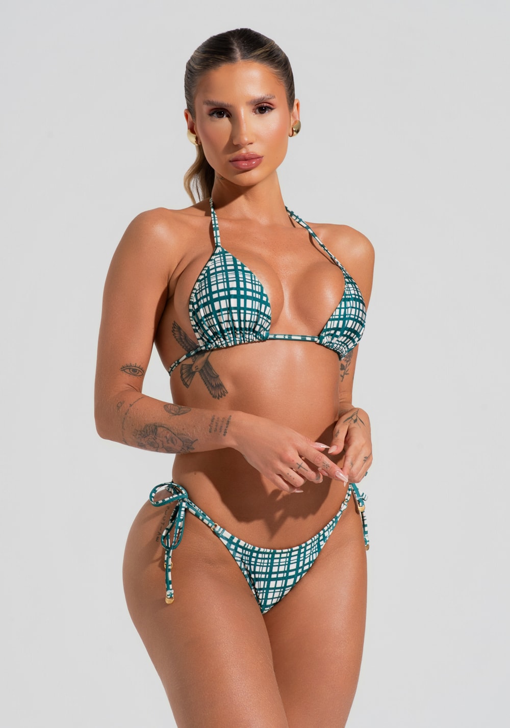 O biquíni cortininha que nunca sai de moda ganha sofisticação e charme com a clássica estampa xadrez e o brilho suave do tecido. Ele possui bojo removível e amarrações ajustáveis que permitem personalizar a sustentação e o estilo de uso.