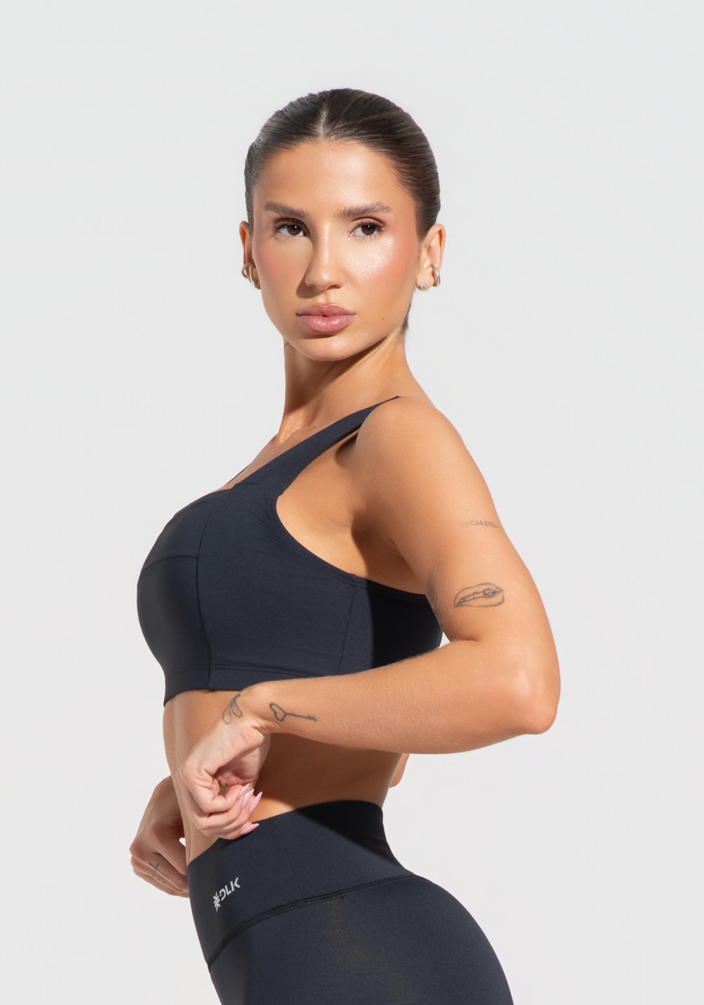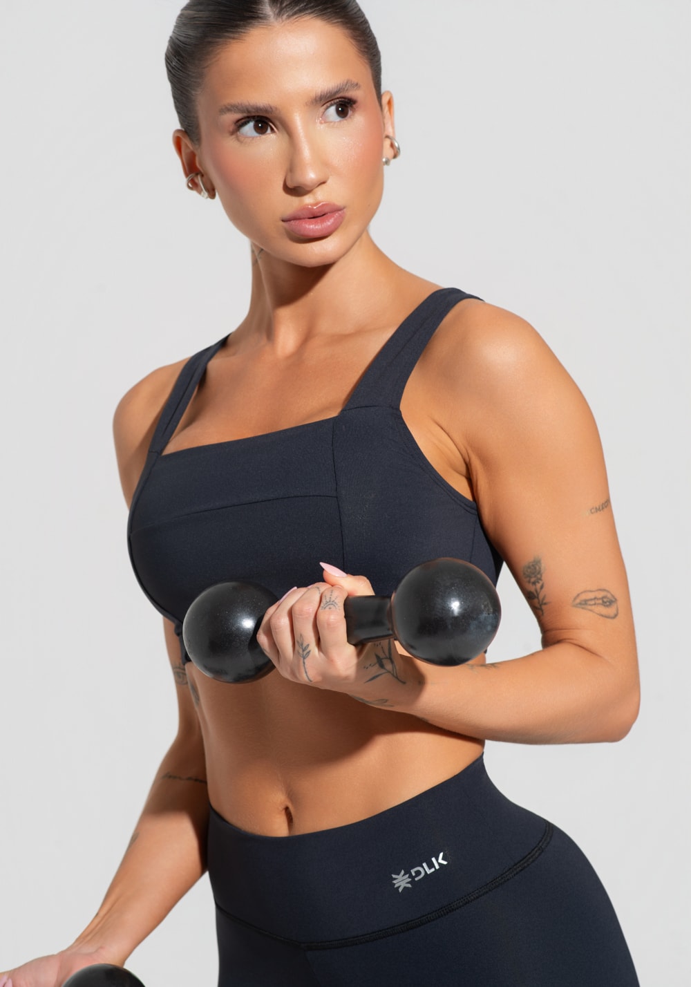 O top com decote reto e recortes estratégicos une design moderno a uma modelagem funcional de compressão média. Com estrutura firme e alças largas, garante sustentação ideal para treinos de baixa a alta intensidade. Os recortes conferem caimento mais anatômico e visual contemporâneo, alinhado com o estilo básico sofisticado da DLK.