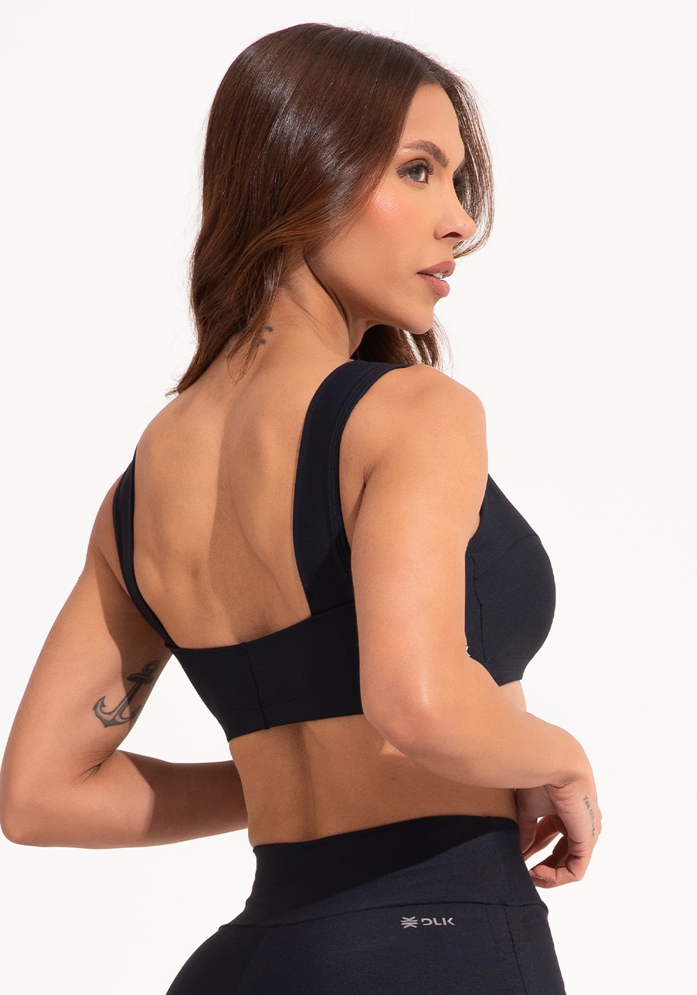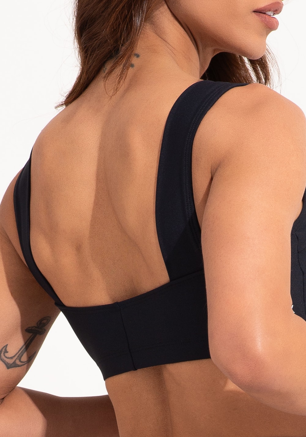 Top fitness feminino preto com alça larga e recortes aura dlk