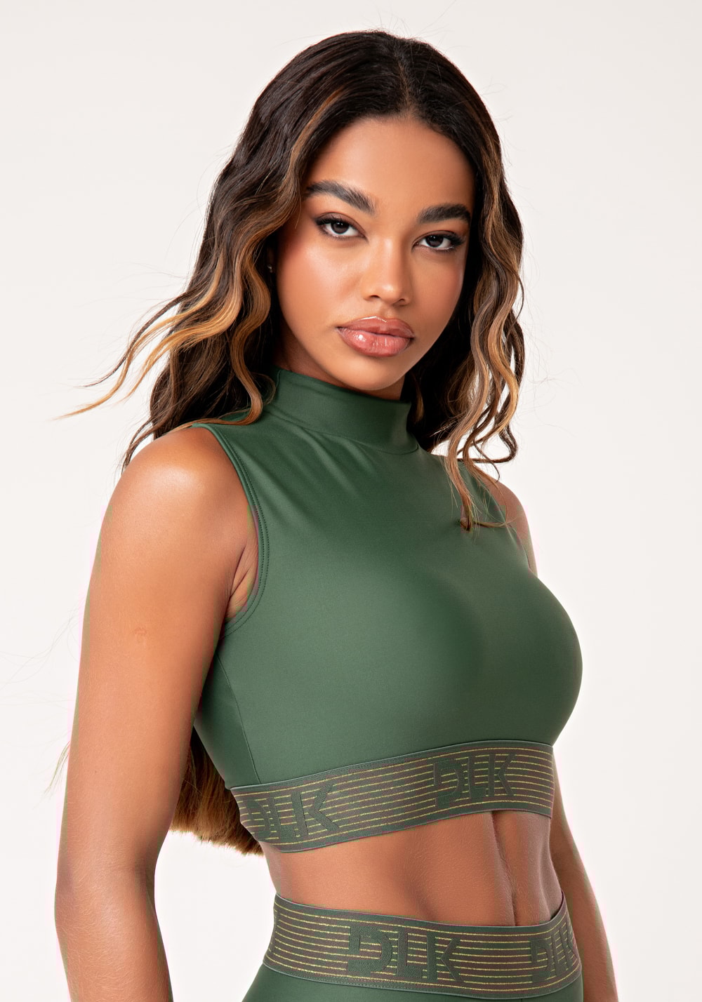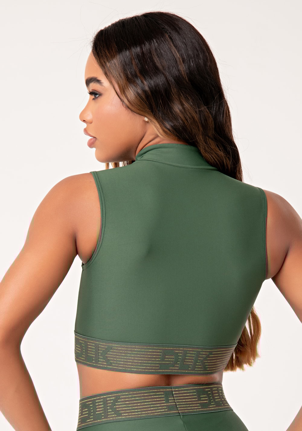 Transforme o seu look de treino com o Top Verde Gola Alta Com Elástico DLK Lurex. Ele possui gola alta anatômica, que se ajusta perfeitamente ao corpo, e elástico personalizado com detalhe em lurex, adicionando um brilho elegante e sutil ao look. Este top é a escolha certa para você se sentir confiante e confortável em qualquer treino ou para compor looks casuais elegantes.