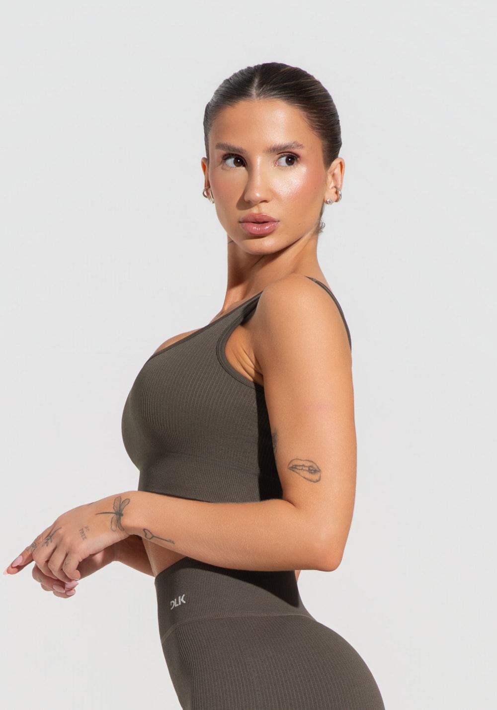 O top canelado com bojo traz uma modelagem básica e atemporal, perfeito para a sua rotina. Com decote arredondado e alças largas, ele oferece sustentação firme e conforto prolongado, ideal para você se movimentar com segurança.