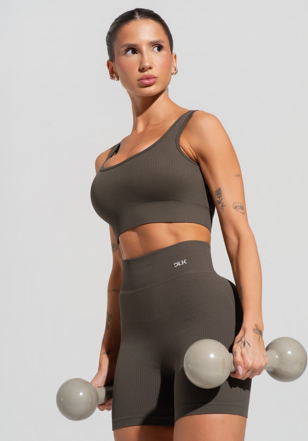 O tecido de poliamida canelada garante toque macio, elasticidade e leve compressão. O bojo removível traz versatilidade de uso, enquanto a tecnologia sem costura promove liberdade e evita atritos.