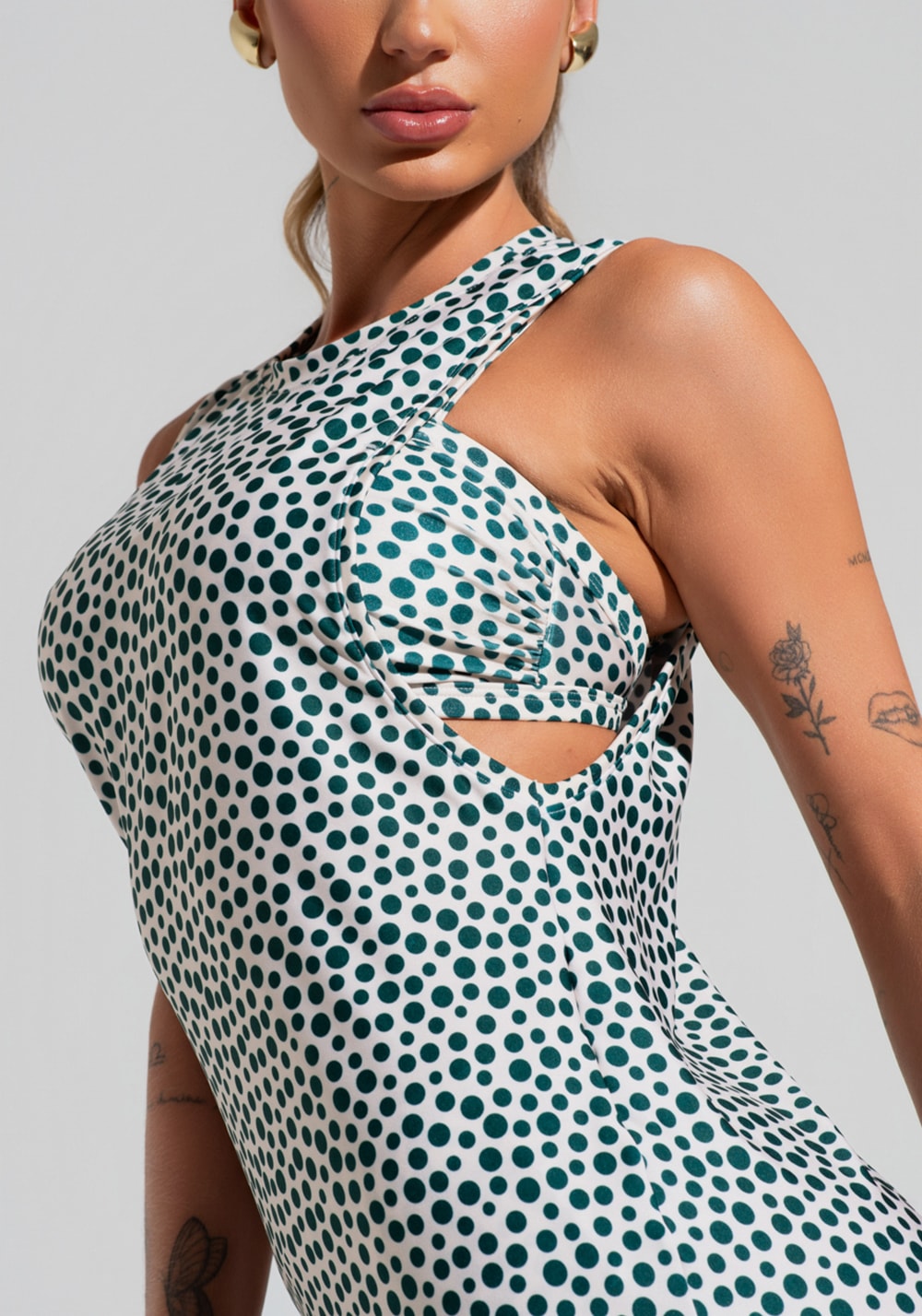Feito em material leve e com secagem rápida, ele possui caimento fluido e comprimento na medida para te acompanhar da areia ao pós-praia. O decote fechado equilibra com as cavas amplas, criando um visual moderno e descomplicado.